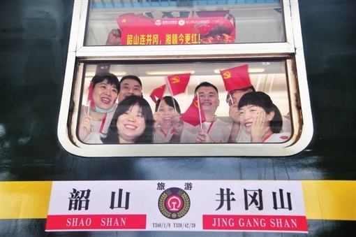 (6月18日上午,韶山火车站,韶山至井冈山红色专列上,首批乘坐的旅客高兴地向窗外挥舞着党旗。湖南日报全媒体首席记者 郭立亮 摄)
