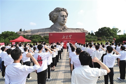 (6月25日上午,长沙橘子洲头,来自省委宣传部、湖南日报社、湖南财政经济学院的党员干部及学生党员共100多人重温入党誓词。 湖南日报全媒体记者 田超 摄)