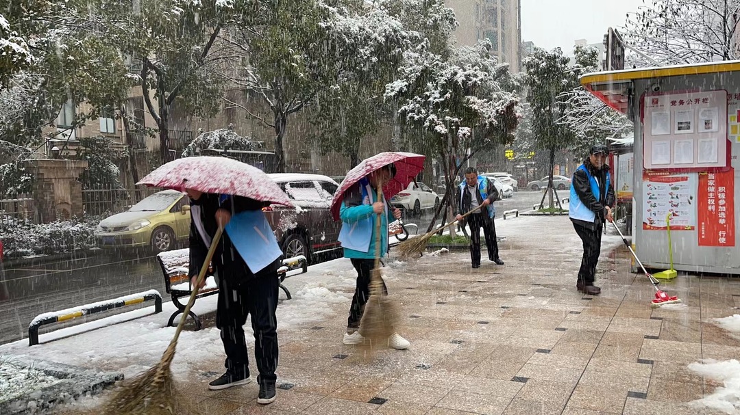 群丰镇新塘社区、马家河街道仙岭社区、新马社区、古桑洲社区、三门镇上节街社区等多个街道社区的志愿者和社区人员一起,以雪为令,深入开展志愿服务扫雪除冰活动,将坡道、弯道及桥梁处积雪进行清扫,避免路面结冰,确保居民安全出行;不仅如此,他们还在社区里安全巡逻,铺上麻袋防滑,为居民出行安全保驾护航。