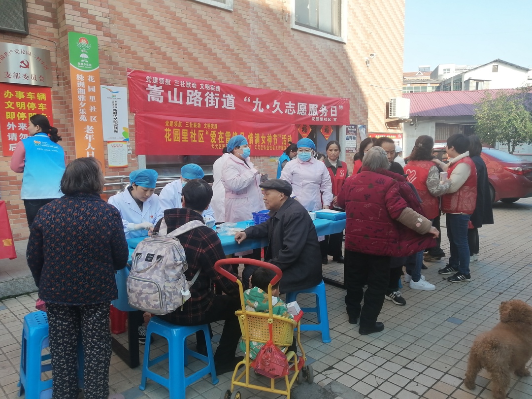 巾帼展风采,建功新时代,为庆贺第112个"三八"国际妇女节,3月8日,嵩山路街道花园里社区开展"爱在雷锋月·情满女神节"活动。现场有义诊、义剪、手机免费贴膜、趣味游戏以及有关政策知识宣传等便民服务。