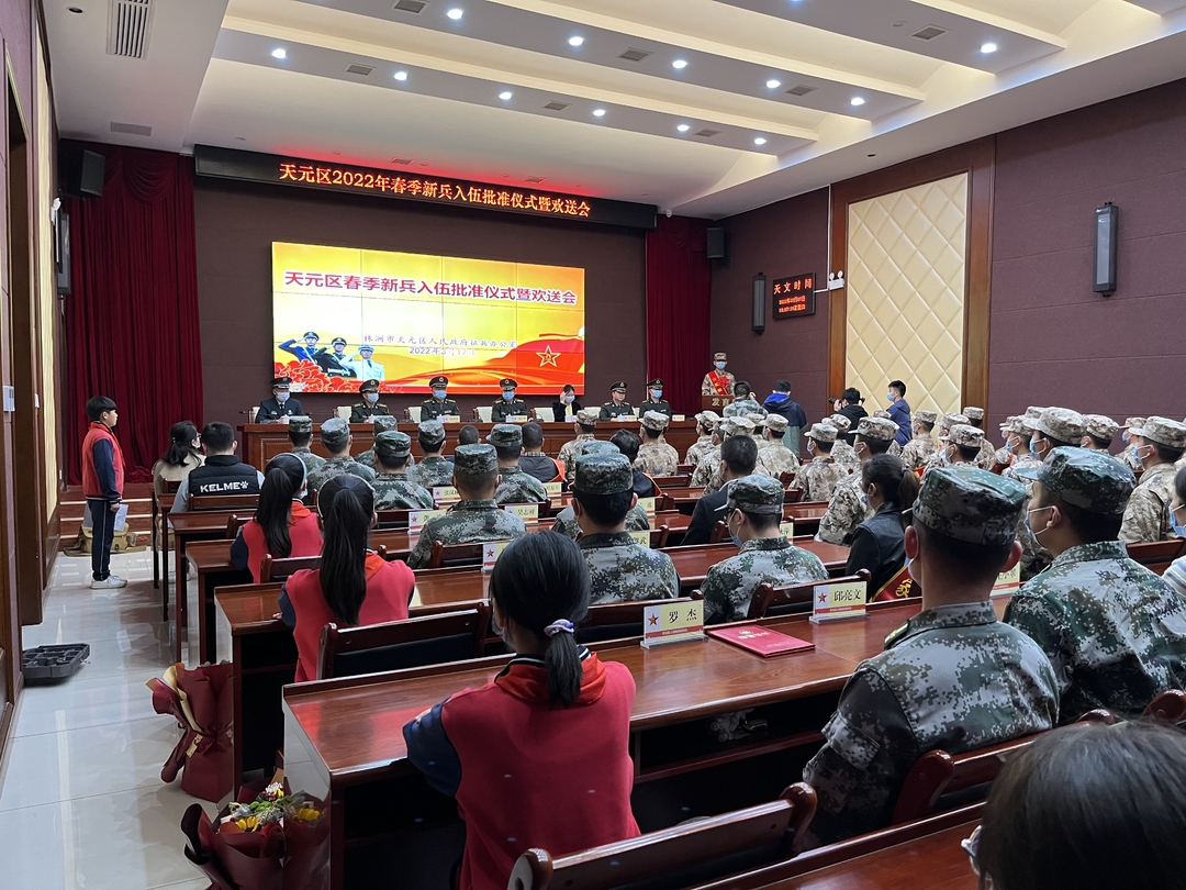 3月17日,天元区举行2022年春季新兵批准仪式暨欢送会。55名“双合格”青年身着崭新的军装,佩戴鲜艳的大红花,踏上军旅征程,履行保家卫国光荣使命。株洲军分区司令员张台华,高新区党工委委员、管委会副主任,天元区委副书记、区长何柢出席欢送会并讲话。