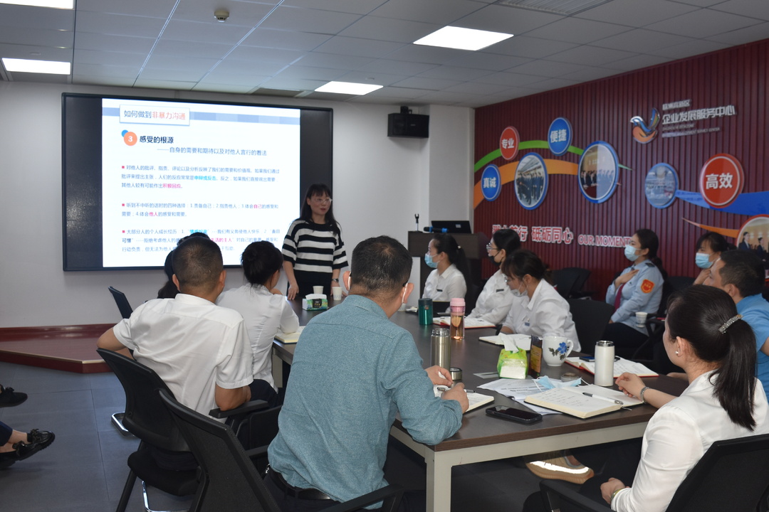 李玲从工作环境、婚姻生活、心理教育等不同环境不同角度,用案例讲授如何做到非暴力沟通,并通过效果对比、现场提问和分享发言,让大家切身感受暴力沟通和非暴力沟通的区别以及不同的沟通效果。并通过身边案例和游戏互动,让参训学员学会观察、用心感受、明白需求、真心请求,在工作和生活中主动运用“非暴力沟通”,从“关爱自己”“体谅他人”达到“有效沟通”。