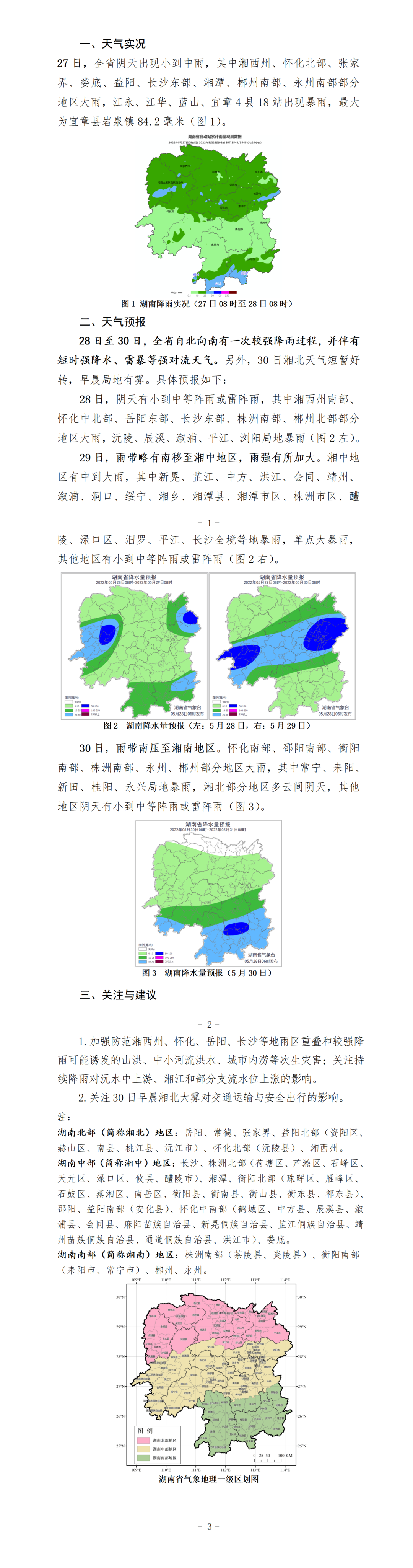 27日永州南部郴州南部局地出现暴雨 28日至30日自北向南有一次较强降雨过程