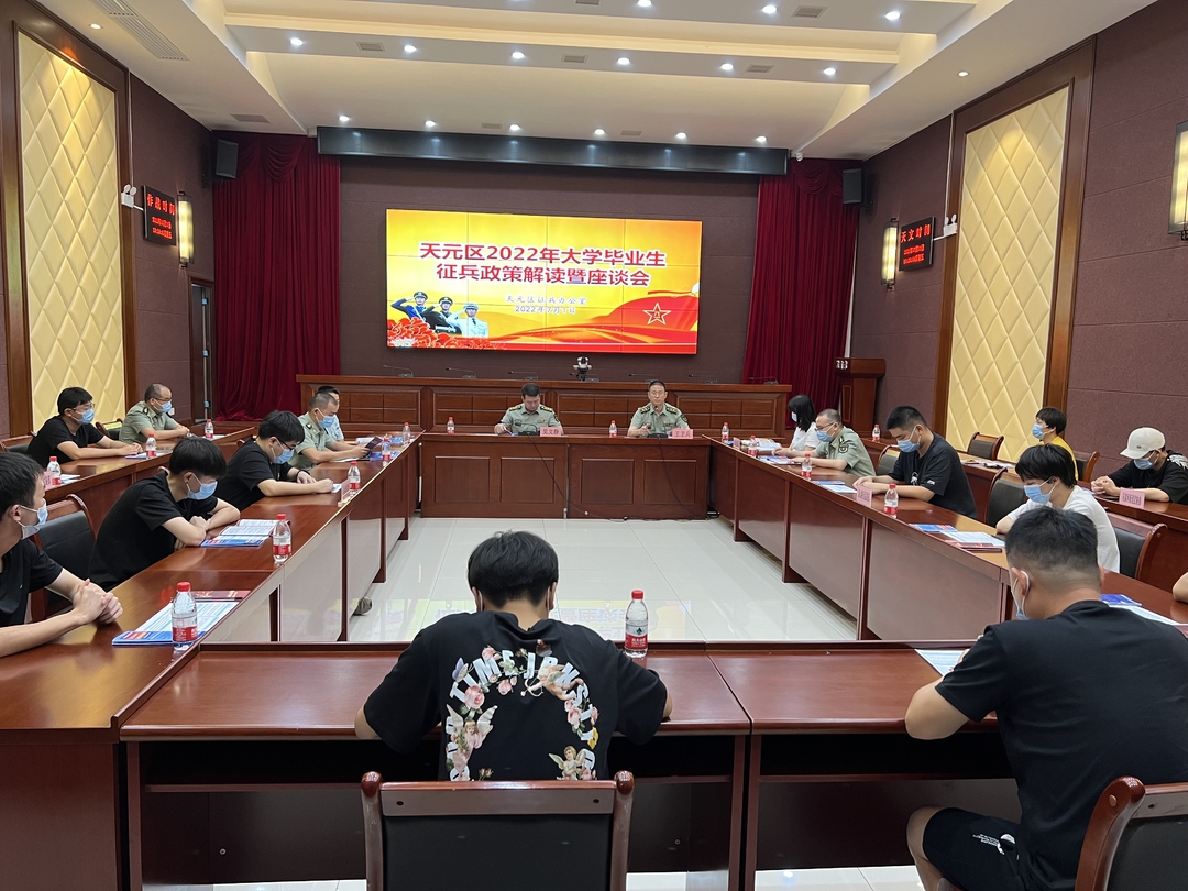 为营造浓厚参军氛围,助力天元学子圆梦军旅、报效国家。7月1日,天元区2022年大学毕业生征兵政策解读暨座谈会在区人武部召开,辖区7个镇街道的大学毕业生以及家长代表齐聚一堂,了解相关政策并作交流。