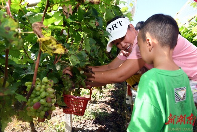 8月8日,塘田市镇对河村葡萄采摘基地,游客正在体验农家乐。湖南日报全媒体记者 田超 摄