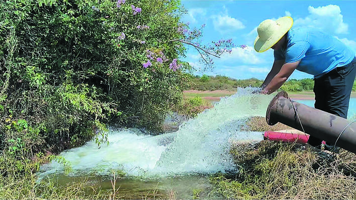 杨柳水库是三门镇最大的水库,也是三门镇南部片区包括湖田村、南江村、松柏村等5个村的主要灌溉来源。因持续高温,各村缺水情况严重,三门镇组织5台大功率水泵24小时不间断抽水,并派专人值守,经北灌渠、南灌渠向南部各村输送水源,通过直接灌溉解决9000余亩农田的干旱问题。