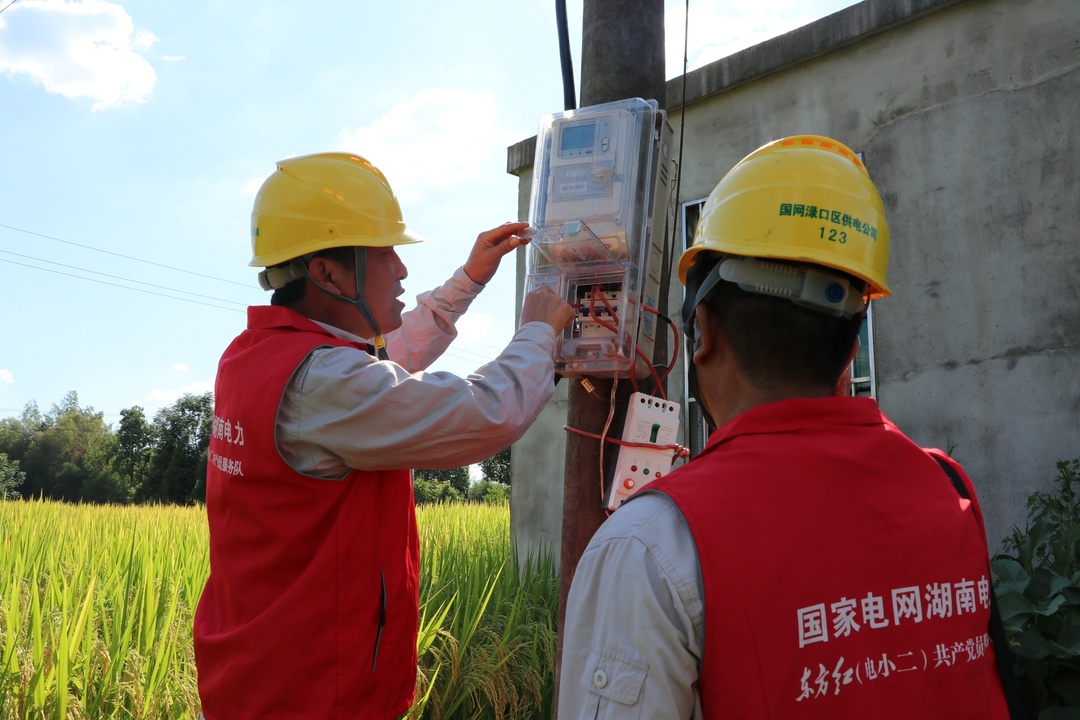 8月17日,在衡南县花桥镇接官亭村,国网衡阳供电公司员工为村民李贤华承包的140余亩水稻田,安装抽水电表和抽水泵,为水稻丰收浇上了最后一道"灌浆水"。国网湖南电力供图