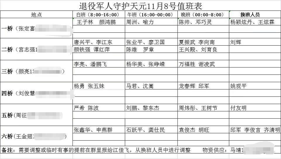 守护天元,退役军人疫情防控有速度。11月6日早上8点,14名退役军人已分别到达6座大桥值守点正式上岗。同时,后勤保障也同步跟上,积极协调租用6个活动板房,采购坐凳、饮用水等物资,联系爱心商家提供三餐,申领防疫物资,确保了疫情防控工作快速有序。