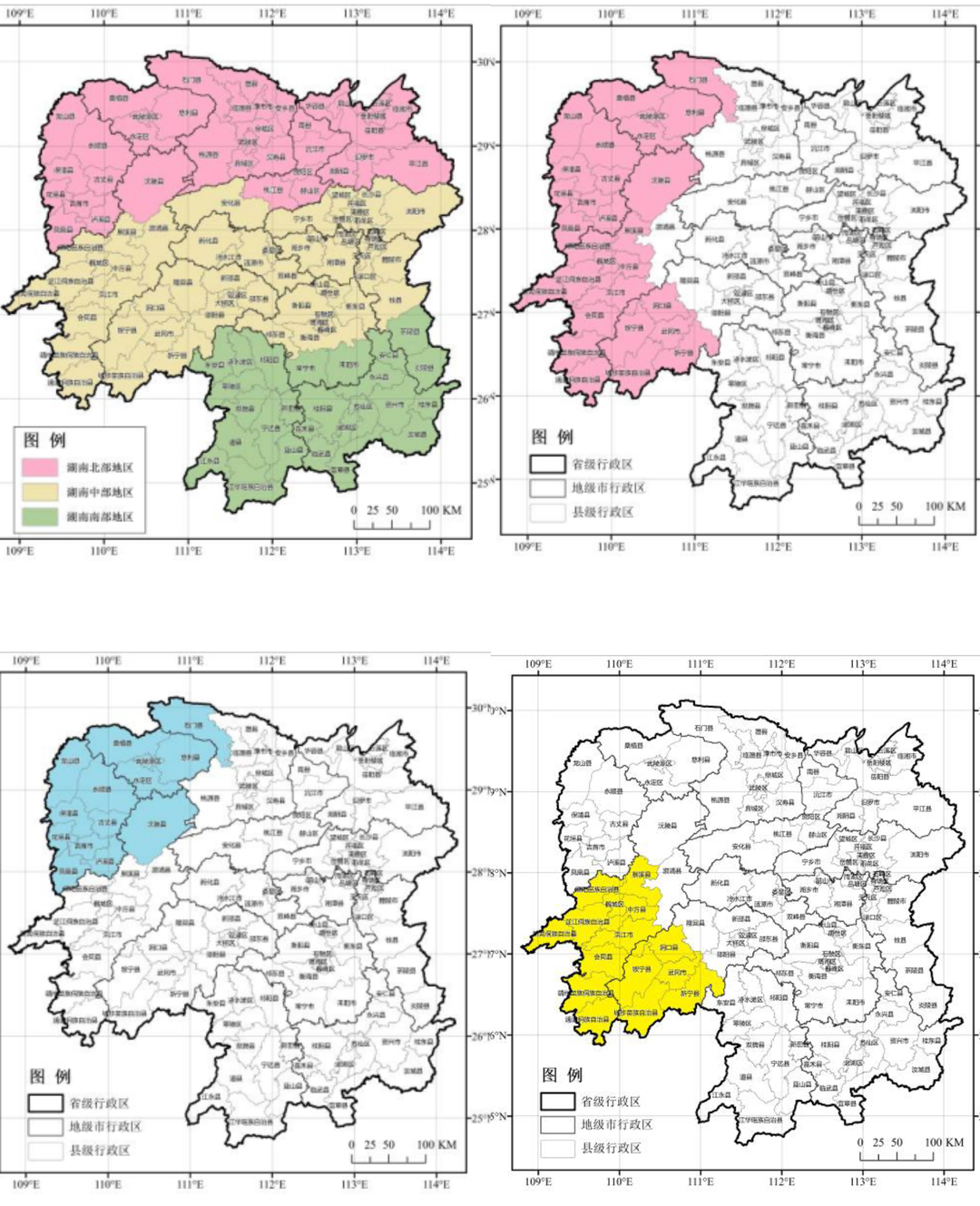 湖南省气象地理区划图(左上:湘北、湘中、湘南;右上:湘西;左下:湘西北;右下:湘西南)