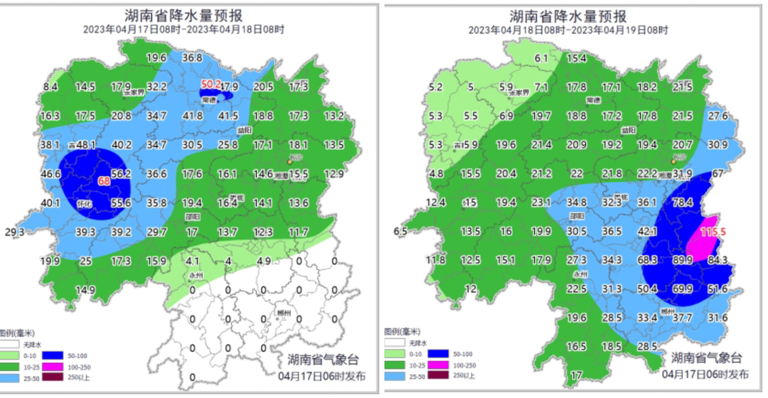 17日,湘南晴天转多云,其他地区晴天转阴天,大部分地区有中到大雨,其中吉首、凤凰、泸溪、怀化市区、辰溪、沅陵、溆浦、中方、芷江、洪江、麻阳、常德市区、安乡、南县有暴雨(图1左)。