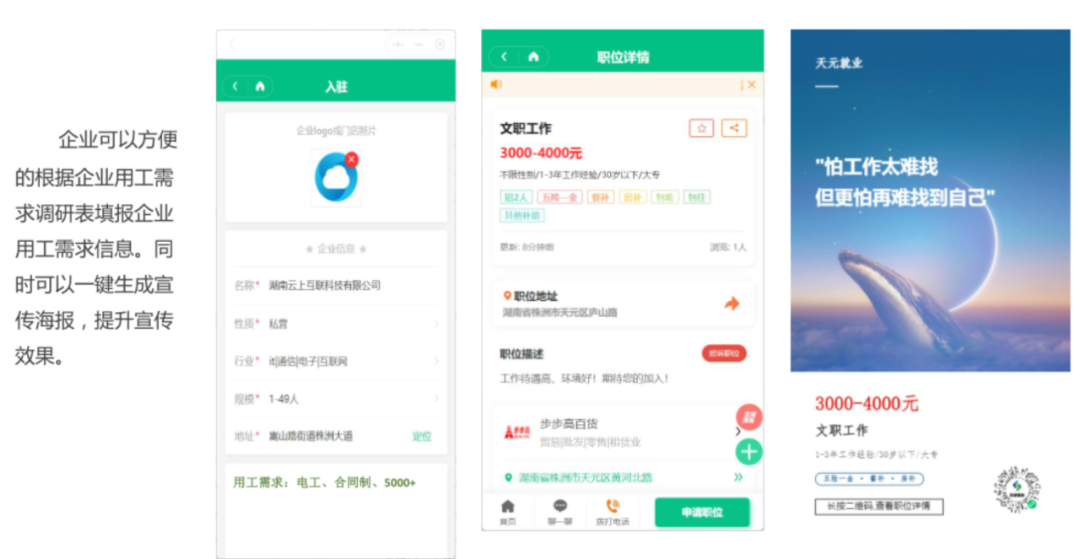 即精准就业服务体系。线上部分,通过微信小程序,进入“天元精准就业平台”,就业招工双方,均可利用该平台匹配求职者和用工岗位;线下部分,为用工企业和求职居民(两个对象)提供精准服务。