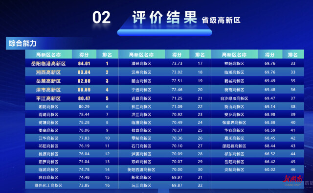 《高新区报告》评价结果显示,长沙高新区、株洲高新区、衡阳高新区分别居全省9个国家高新区的前三位;岳阳临港高新区、湘西高新区、岳麓高新区、津市高新区和平江高新区位居全省46家省级高新区的前五位。