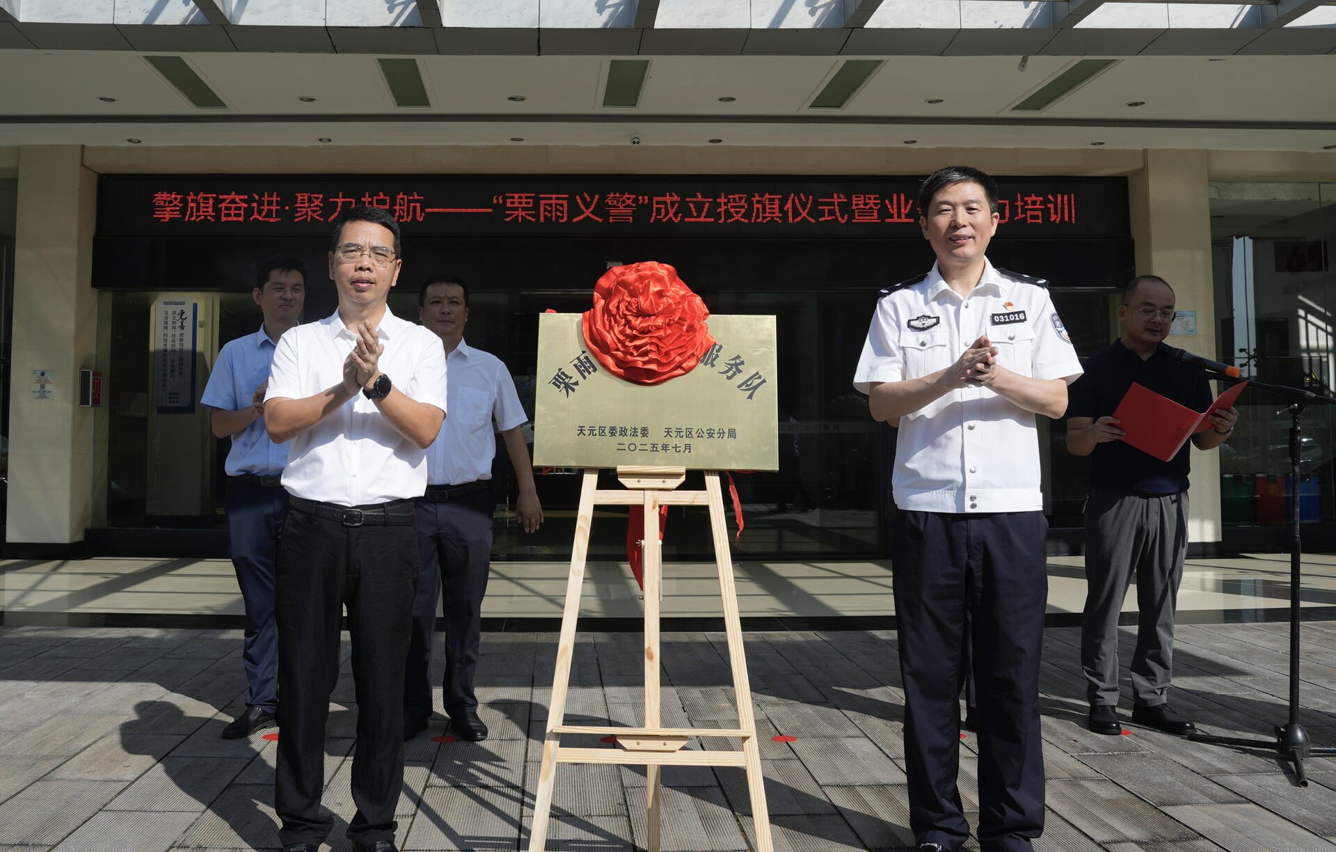 成立仪式上,激昂的《人民警察之歌》点燃了每一位义警心中的热血与激情。义警代表掷地有声的发言表达了全体义警投身平安建设的热情和决心。天元区政府副区长、区公安分局党委书记、局长罗浪郑重擎起“栗雨义警”志愿服务队队旗授予队长陈雪意,鲜红队旗不仅是荣誉的象征,更承载着守护辖区平安的重任。株洲高新区党工委委员、天元区委副书记、政法委书记袁哲明出席活动并讲话,鼓励大家用行动践行责任。袁哲明和罗浪共同为“栗雨义警志愿服务队”揭牌,标志着这支充满活力与担当的队伍正式扬帆起航。