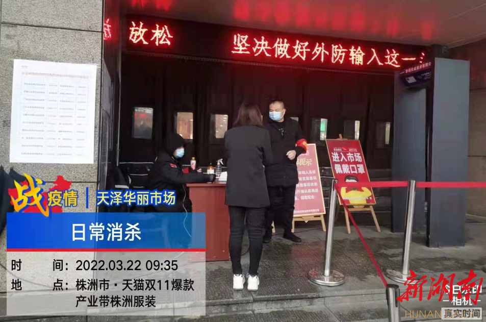 芦淞市场群天泽华丽市场,工作人员要求进场顾客戴好口罩,测量体温,查验健康码、行程码、场所码,引导大家保持安全距离,有序排队。督导10个临街门面张贴场所码,要求市场背包队对风险地区货包进行消毒,并对市场一天两次进行全面消毒。