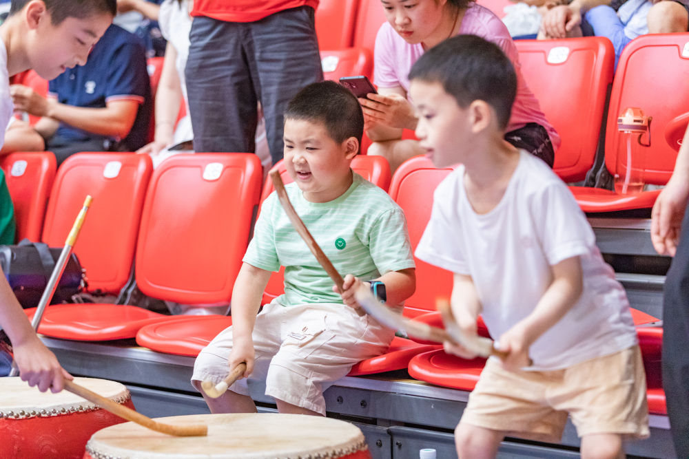 5月28日晚,小朋友在场边为球员击鼓加油。