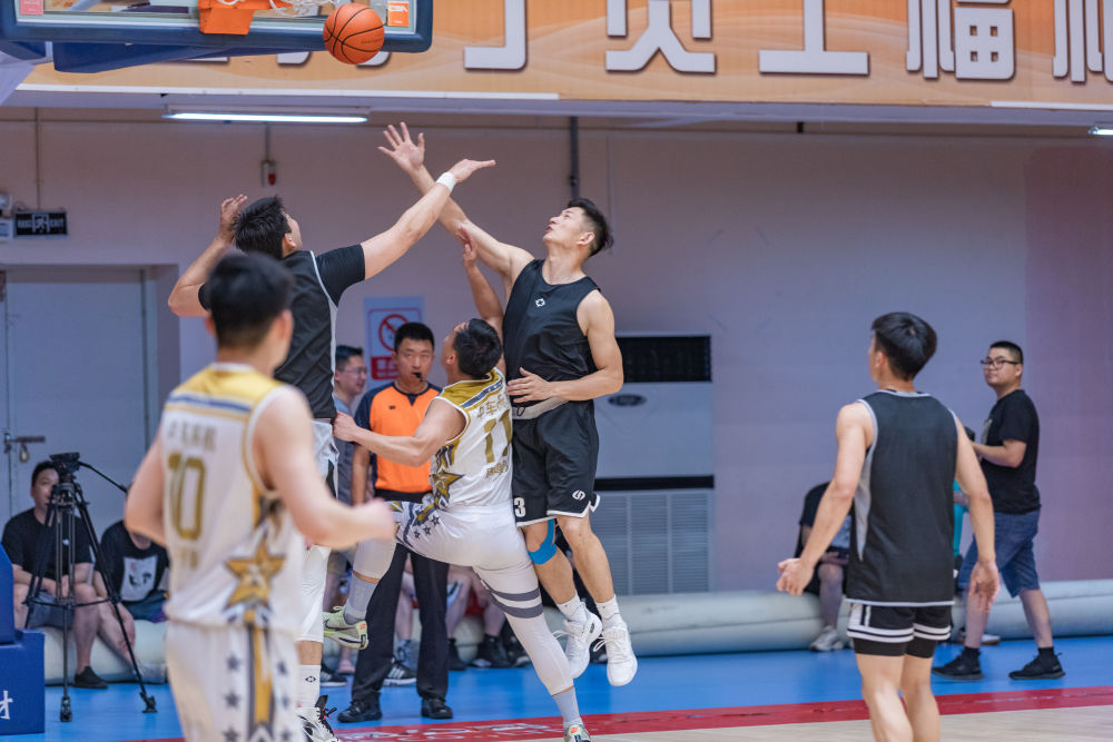 5月28日晚,来自中车株机与北京汽车的球员在争夺篮板球。