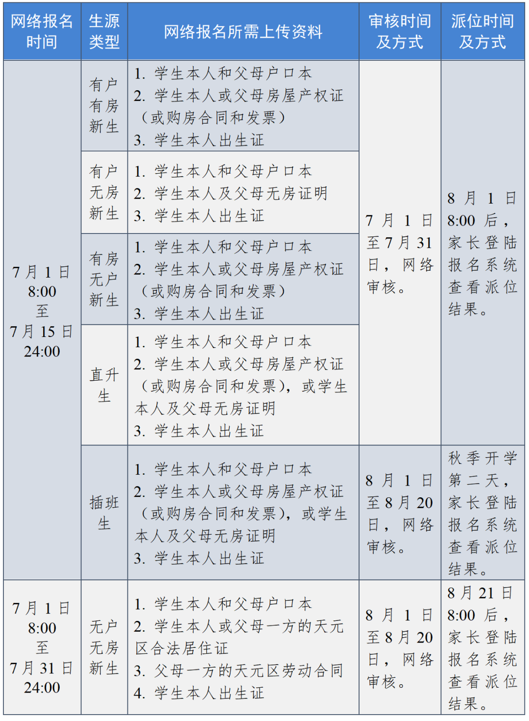 具体指适龄儿童(少年)和父母落户天元区城区集体单位的,或适龄儿童(少年)和父母户籍寄挂在天元区城区的,参照有户类新生于7月1日至15日进行网络报名,由区教育局根据全区剩余学位情况于8月下旬统筹安排入学。