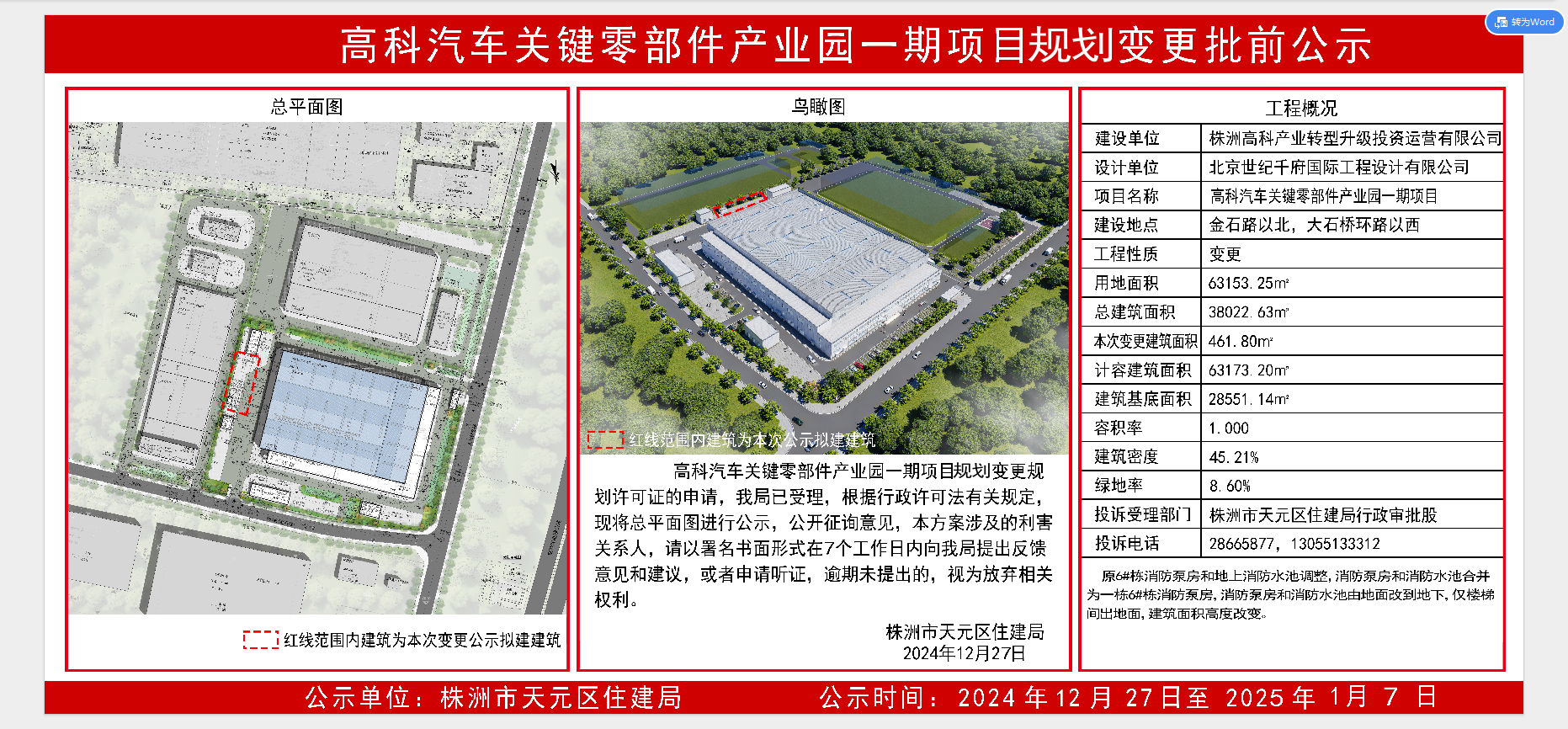 高科汽车关键零部件产业园一期项目规划变更批前公示