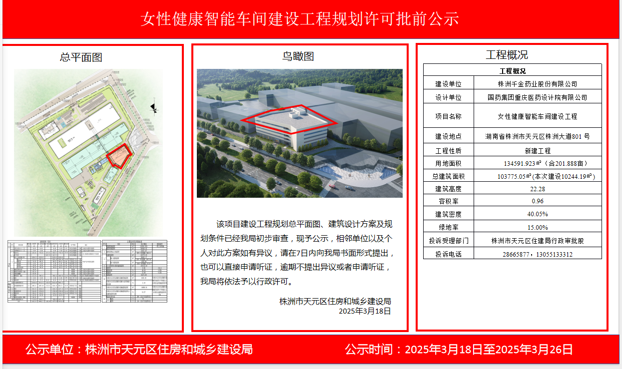 株洲千金药业股份有限公司女性健康智能车间项目建设工程规划许可批前公示