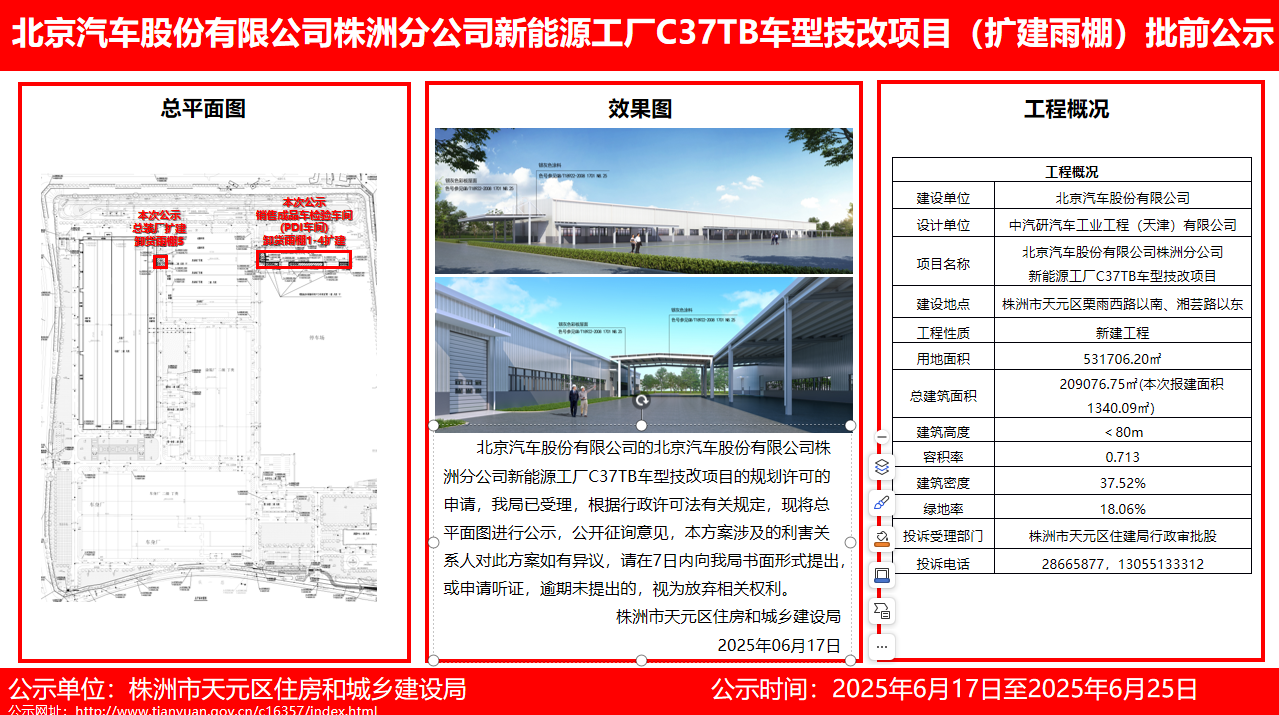 北京汽车股份有限公司株洲分公司新能源工厂C37TB车型技改项目(扩建雨棚)建设工程规划许可批前公示