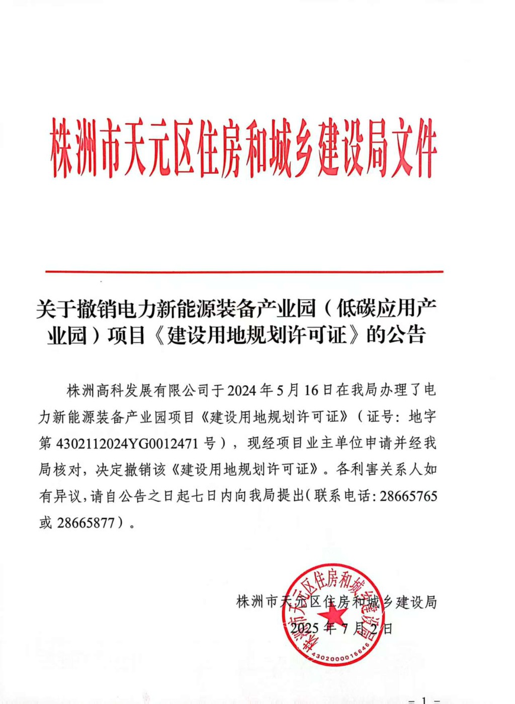 关于撤销电力新能源装备产业园(低碳应用产业园)项目《建设用地规划许可证》的公告