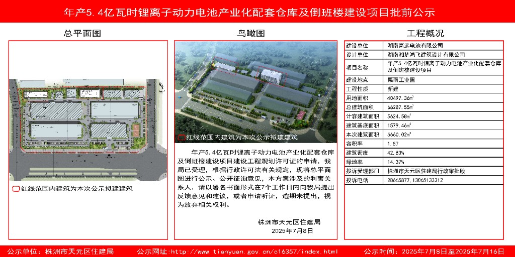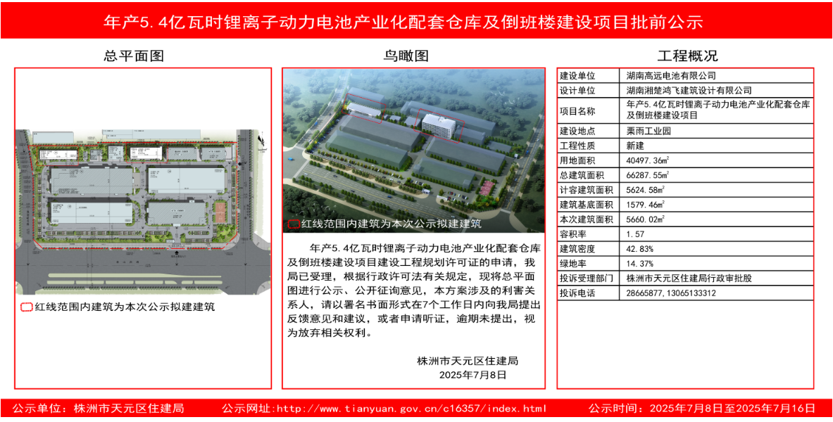 年产5.4亿瓦时锂离子动力电池产业化配套仓库及倒班楼建设项目建设工程规划许可批前公示