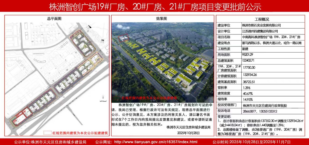 中南高科株洲智创广场19#厂房、20#厂房、21#厂房项目规划变更批前公示