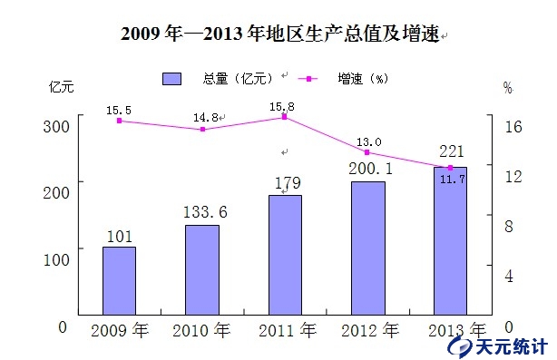 初步核算,全区地区生产总值221亿元,比上年增长11.7%。其中,第一产业增加值8.25亿元,增长3.1%;第二产业增加值117.8亿元,增长13.0%;第三产业增加值94.9亿元,增长10.8%。按常住人口计算,人均地区生产总值77700元,较去年人均增加6662元。