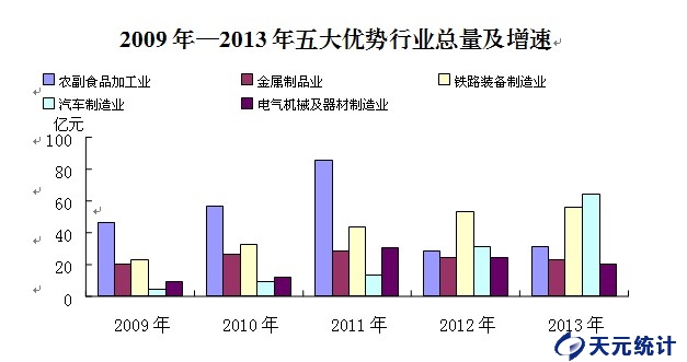 在全区23个规模工业大类行业中,有15个行业实现增长。其中,五大优势行业共完成产值194.6亿元,增长20.8%,拉动规模工业增长15.1个百分点,产业聚集效应显现。汽车制造业、农副食品加工业、铁路装备制造业等支柱行业分别增长108.8%、11.7%、4.3%,2013年北汽公司累计生产整车超过15万辆,汽车制造业超过铁路装备制造业。