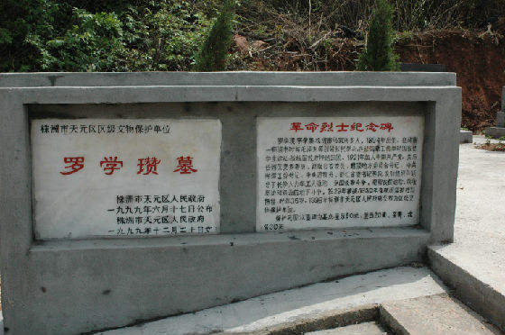 罗学瓒烈士墓现为市级文物保护单位及爱国主义教育基地,位于天元区马家河镇月塘社区。罗学瓒(1894-1930),湖南省湘潭县人。一九一八年参与组织新民学会,一九一九年赴法国勤工俭学,一九二一年十一月加入中国共产党。历任中共湘区区委委员、湘南区委宣传部长、酆陵和湘潭县委书记、浙江省委宣传部长、代理书记、中共特派员等职。一九二九年四月三十日被捕,囚禁于浙江陆军监狱。一九三零年八月二十七日壮烈牺牲。