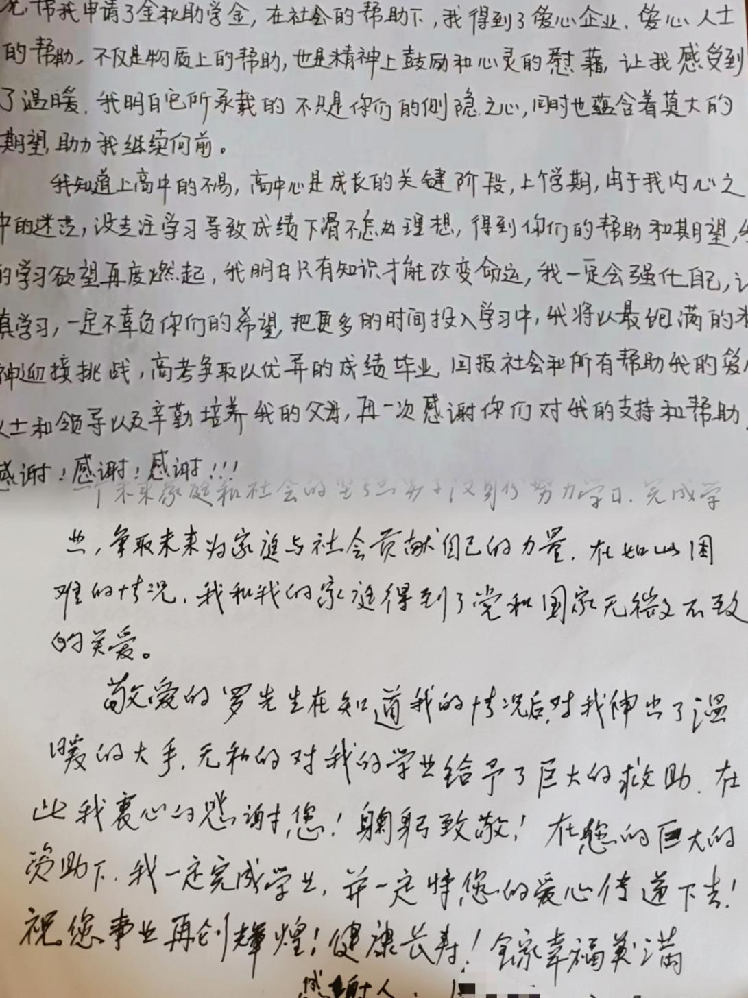“非常感谢政府及社会爱心人士的关心关爱,我定不负众望,发奋读书,将来做一个对国家、社会有用的人,用所学的知识和本领回报社会。”受资助的困难学生纷纷录制了视频及手写信来表达对爱心企业家罗永民先生的感谢。