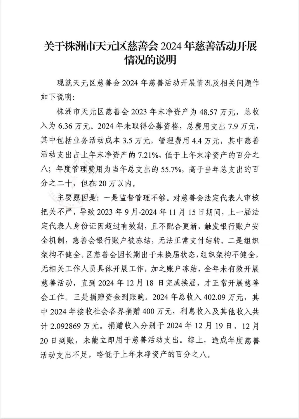 关于株洲市天元区慈善会2024年慈善活动开展情况的说明