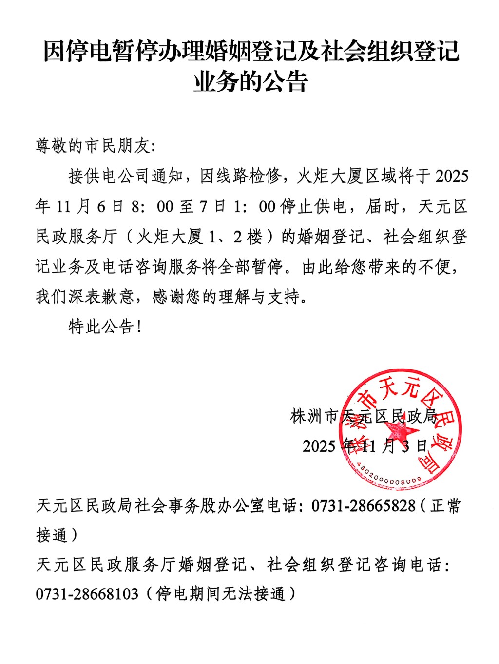 因停电暂停办理婚姻登记及社会组织登记业务的公告