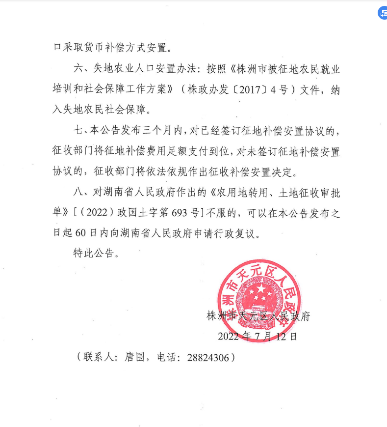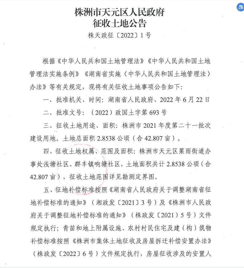 株洲市天元区人民政府征收土地公告(株天政征〔2022〕1号)