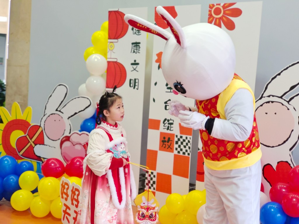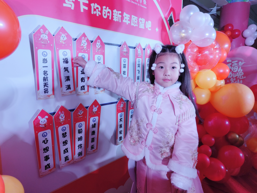天台小学的孩子们身着喜庆的汉服走进校园,在喜气洋洋的大道上“兔”个好彩头,身穿大红袄的“天台兔”为孩子们送上新春的祝福和糖果,孩子们手持各式手工作品与“福兔”合影,满心欢喜,开启新征程,期待新学期大展宏“兔”。