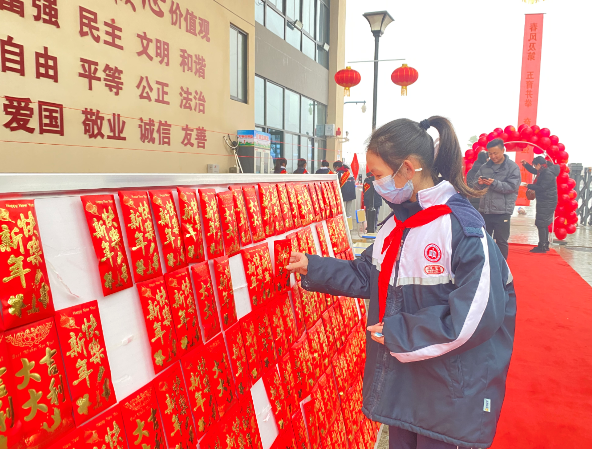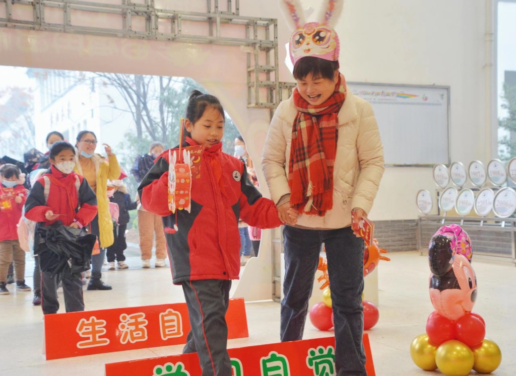 新马小学的校园里处处洋溢着喜悦的氛围,月亮门处悬挂着对联、灯谜、好书推荐和诗词佳句,老师们给孩子们分发新年红包,祝愿孩子们新学期好运连连。每一个入校的孩子们还需要跨过老师们提前在校门口设立的“生活自理”“行为自律”“学习自觉”“人格自强”“文化自信”五道坎,期盼孩子们在新学期像今天的步伐一样坚定,一步一书香,更上一层楼。
