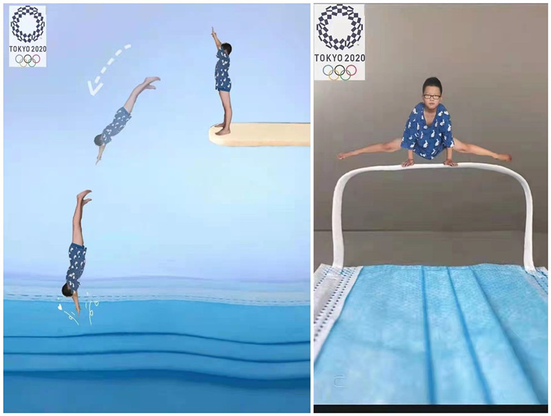 除了线上“秀才艺”,线下“运动打卡”也成为孩子们减压的首选。天台小学杨佩琳每天完成作业后,空余时间也为了增加生活乐趣在家坚持跳绳、仰卧起坐、吊杆,过的充实又有意义的居家生活。尚格小学金洪宇宅在家里看东京奥运会,他和妈妈一起动手制作起来,用口罩的创意来为奥运健儿们加油助威,自己也体验了一把当奥运冠军的感觉。