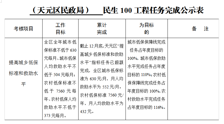 天元区民政局“民生100”工程指标任务完成情况公示(救助)