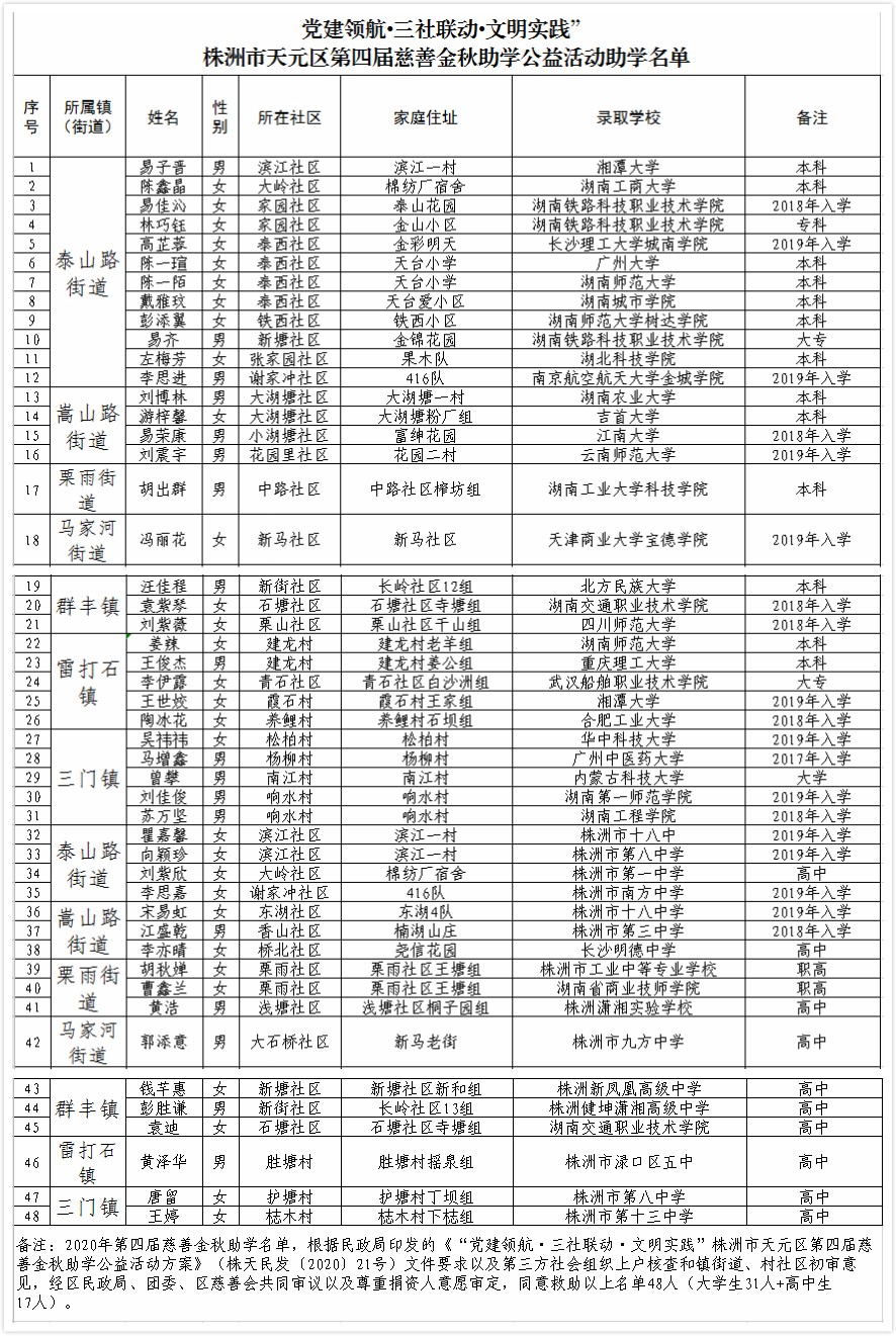 附:“党建领航•三社联动•文明实践”株洲市天元区第四届慈善金秋助学公益活动助学名单