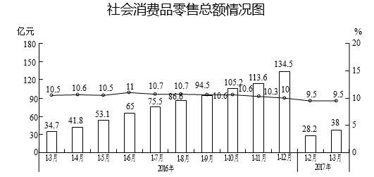 一季度,全区实现社会消费品零售总额38亿元,增长9.5%,其中:限上商贸企业实现零售额25.5亿元,增长3.8%,分别比1-2月(2.2%)、去年同期(-4.0%)加快1.6个、7.8个百分点。