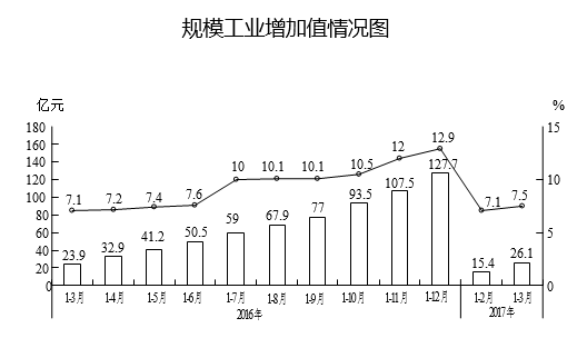 一季度,全区121家规模工业企业完成总产值83.4亿元,同比增长9.5%,分别较1-2月(9.4%)、去年同期(4.4%)加快0.1和5.1个百分点;实现规模工业增加值26.1亿元,增长7.5%,增速居全市第1。