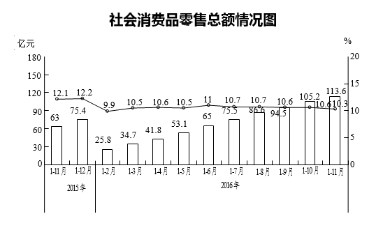 1-11月,我区实现社会消费品零售总额突破百亿,达到113.6亿元,增长10.3%,其中:限上企业实现零售额94.6亿元。