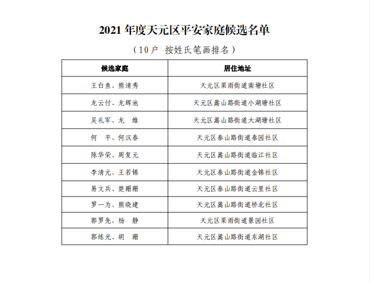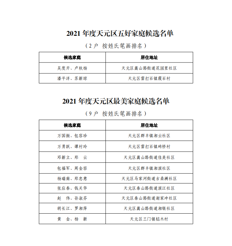 根据《关于做好2021年度天元区五好家庭、最美家庭评选工作的通知》《关于开展2021年度天元区平安家庭评选工作的通知》文件精神,经各镇(街道)妇联、区直机关、市直驻区、企事业单位、有关社会团体等单位积极推荐申报,相关职能部门联合审查,天元区妇联党组会议研究决定,将2021年度天元区五好家庭、最美家庭、平安家庭等21户候选家庭名单于2022年5月5日至5月10日在天元区政府门户网妇联子站、天元幸福女声微信公众号进行公示,接受社会监督。