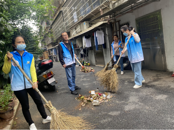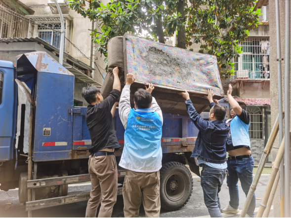 活动现场,志愿者身着蓝马甲,分成两组,分工合作,一组负责清理小区公共区域乱堆乱放杂物,搬运废旧物品,将小区内杂物乱摆放的现状进行整理。另一组则负责清理小区内公共区域、花坛、楼梯间及卫生死角。