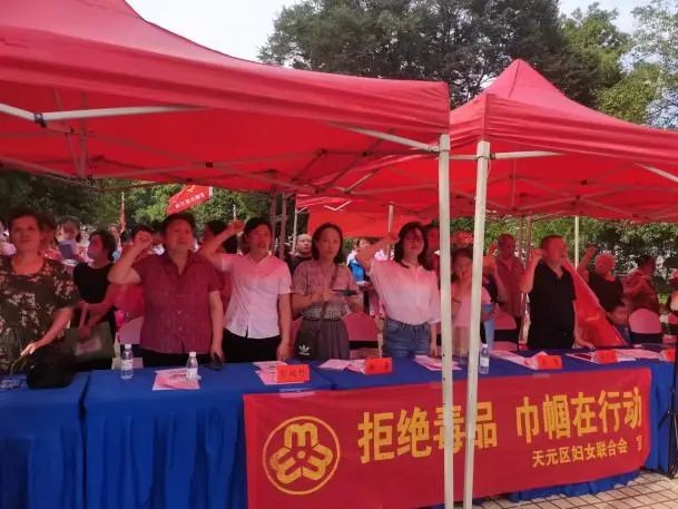 在第35个“国际禁毒日”来临之际,为进一步普及毒品预防知识,浓厚禁毒宣传氛围。2022年6月25日下午,区妇联进驻小区工作队联合桥北社区到太阳宫前坪,开展“文艺轻骑兵,创文进社区”暨“禁毒宣传进万家”——2022年天元区全民禁毒宣传月主题活动。活动中,区妇联带领在场所有人员进行禁毒宣誓。宣誓内容提到,筑牢思想防线,让禁毒之声唱响天元。