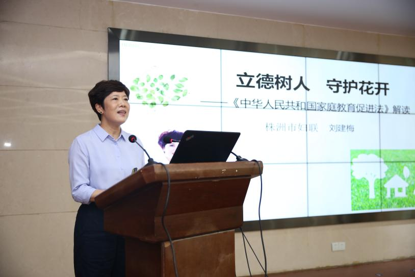 株洲市驻天元区疫情防控特派员、市妇联四级调研员、家儿部部长刘建梅授课《中华人民共和国家庭教育促进法》解读及《公务礼仪》。