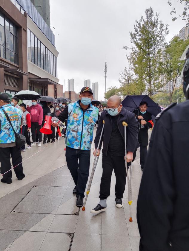 "大爷,您慢点,别着急,我扶您过去。"早上八点半,退役军人石跃平等人就来到天元区栗雨街道菱溪社区圣桦D6区核酸检测采样点,协助社区维持秩序,为群众提供服务和帮助。