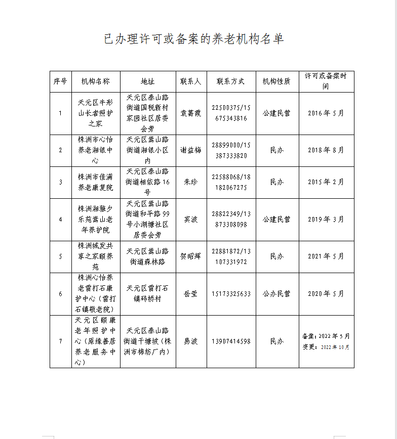 为加强养老服务机构管理,维护老年人的合法权益,促进我区养老服务事业健康有序发展。现将最新的天元区已备案登记的养老机构名单进行公示。请广大市民密切关注天元区人民政府官网,并提醒身边老人及亲属,选择已备案登记的养老机构,警惕以“大额预付费”“会员卡”“投资入股”“养老公寓”“养老地产”“保健品”等名义向老年人或不特定公众吸纳资金的行为,确保老年人的生命财产安全。