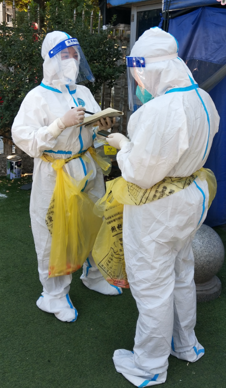 八点集合,在医务人员的帮助下,她全身套上了薄薄的但不透气的防护服,戴了专门的防疫口罩、防护面罩和医用橡胶手套。在社区人员的指导下,她负责小区核酸检测的“信息扫码”工作。一开始还好,可两个小时后,天气开始热了,衣服里面的热度直线上升,全身冒汗,呼吸难受。因为不方便擦拭或脱换衣服,直到扫码完最后一个需要检测的居民,她才开始脱下防护服。