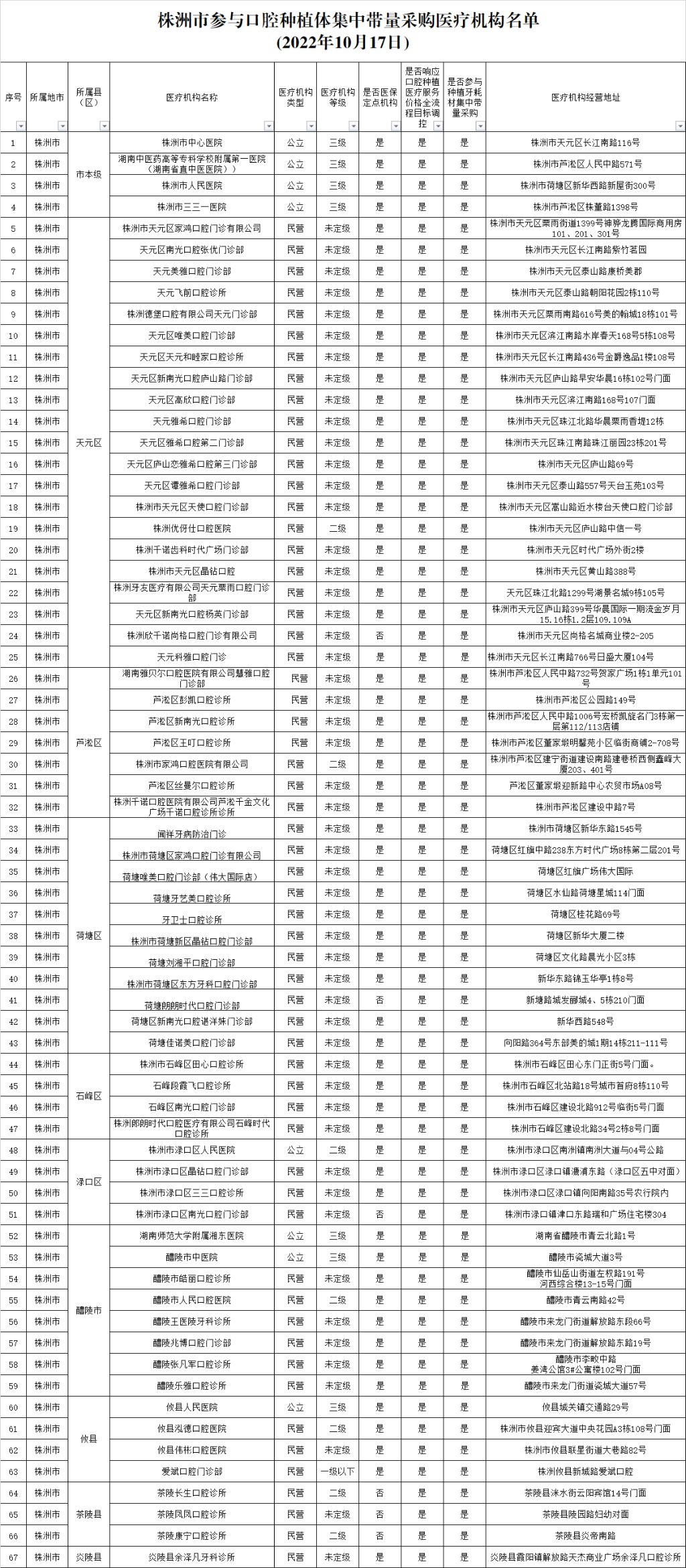 为切实减轻群众种植牙负担、促进种植牙行业健康可持续发展,保障口腔种植医疗质量稳步提升,按照《国家医疗保障局关于开展口腔种植医疗服务收费和耗材价格专项治理的通知》(医保发〔2022〕27号)、《国家医疗保障局关于开展口腔种植体集中带量采购工作的预通知》(医保价采函〔2022〕125号)等文件要求和省医保局相关工作部署,现对株洲市范围内参与口腔种植体集中带量采购的相关医疗机构名单予以公示,供广大群众参考。